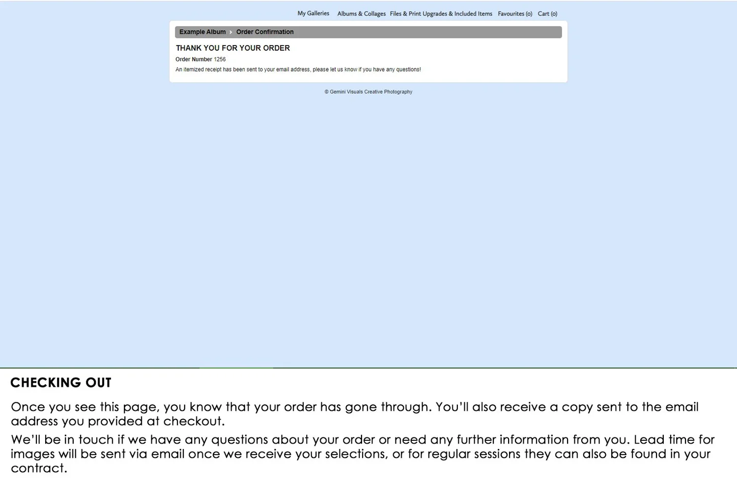 Make sure to completely finish the checkout process, or you will have to re-choose your images. You will see this page once you’ve successfully completed selection.